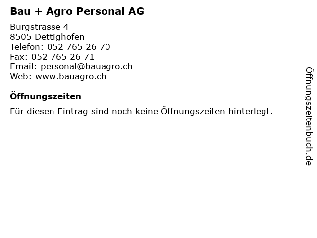 | Öffnungszeiten Bau + Agro Personal AG in Dettighofen anzeigen | |