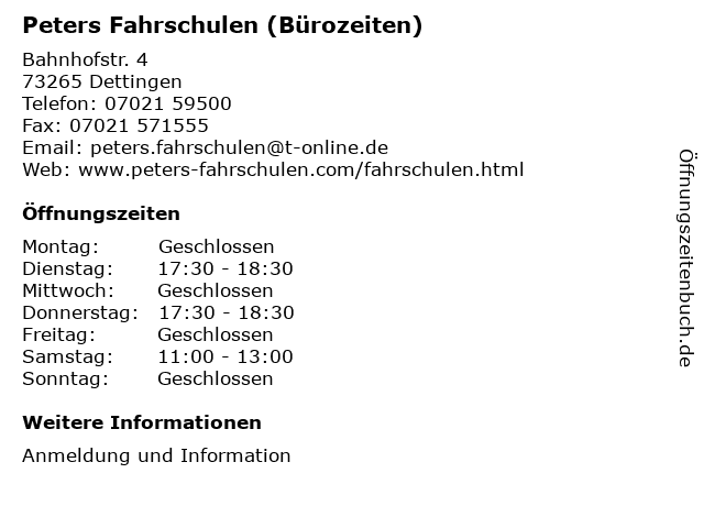 Branchen & Suchbegriffe zu Peters Fahrschulen (Bürozeiten):anmeldung, auto, autofahren, bürozeiten, dettingen, fahrschule, fahrschulen, fahrschulunterricht, führerschein, information, peters, pkw |