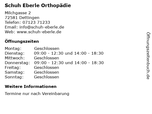 | Öffnungszeiten Schuh Eberle Orthopädie in Dettingen anzeigen | |