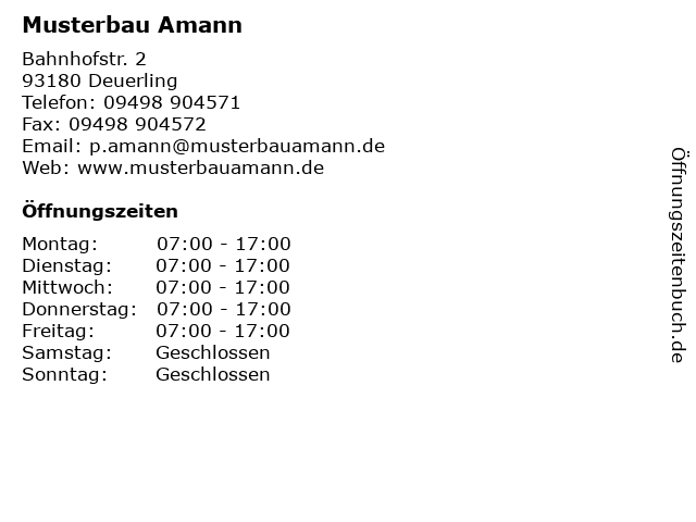 | Öffnungszeiten Musterbau Amann in Deuerling anzeigen | |