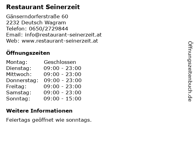 | Öffnungszeiten Restaurant Seinerzeit in Deutsch Wagram anzeigen | |