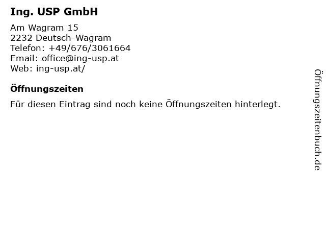 | Öffnungszeiten Ing. USP GmbH in Deutsch-Wagram anzeigen | |