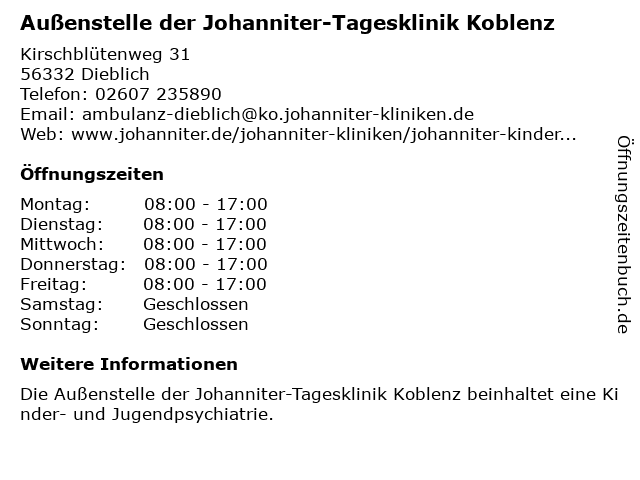 Branchen & Suchbegriffe zu Außenstelle der Johanniter-Tagesklinik Koblenz:außenstelle, johanniter, tagesklinik |