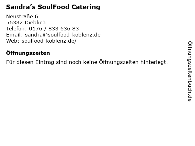 Öffnungszeiten Sandra’s SoulFood Catering in Dieblich anzeigen | |
