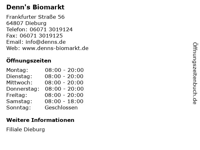 | Öffnungszeiten Denn's Biomarkt in Dieburg anzeigen | |