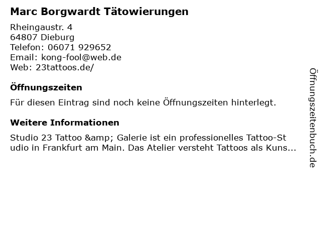 | Telefonnummer Marc Borgwardt Tätowierungen in Dieburg (06071 929652) anrufen | |