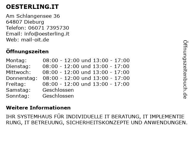 | Öffnungszeiten OESTERLING.IT in Dieburg anzeigen | |