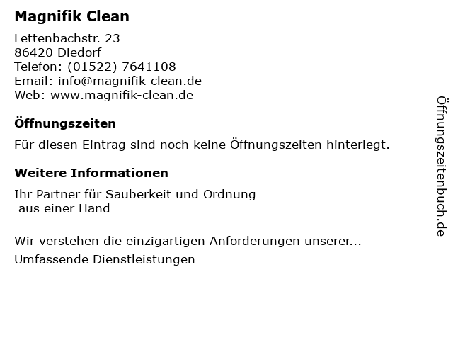| Öffnungszeiten Magnifik Clean in Diedorf anzeigen | |