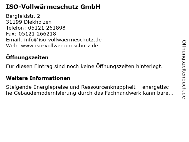 | Öffnungszeiten ISO-Vollwärmeschutz GmbH in Diekholzen anzeigen | |