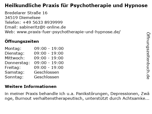 2 Dorothee Dolle-Bürckner Praxis für Naturheilkunde und Hypnose (Entfernung: 33,88 km) Schumannstr. 22, 59581 Warstein 3 Gregorovius, Wolfgang Hypnose (Balneologie) (Entfernung: 34,98 km) Poststrasse 1, 34537 Bad Wildungen 4 Heilpraktikerin für Psychotherapie Sandra Witulla (Entfernung: 35,21 km) Gartenstraße 1, 59581 Warstein 5 Praxis Heilpraktiker für Psychotherapie Ralf Baumhöfer in Salzkotten (Entfernung: 38,77 km) Lindentrift 36, 33154 Salzkotten 6 |