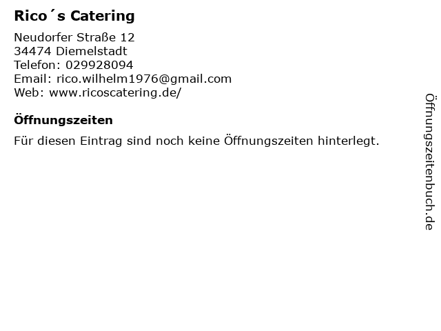 | Öffnungszeiten Rico´s Catering in Diemelstadt anzeigen | |