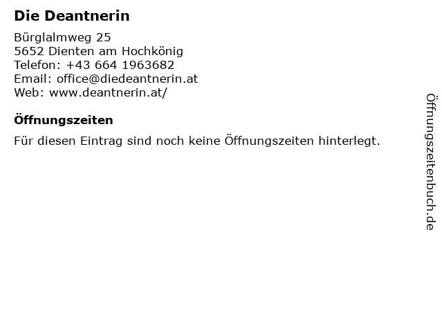 | Öffnungszeiten Die Deantnerin in Dienten am Hochkönig anzeigen | |