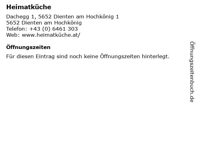 | Öffnungszeiten Heimatküche in Dienten am Hochkönig anzeigen | |