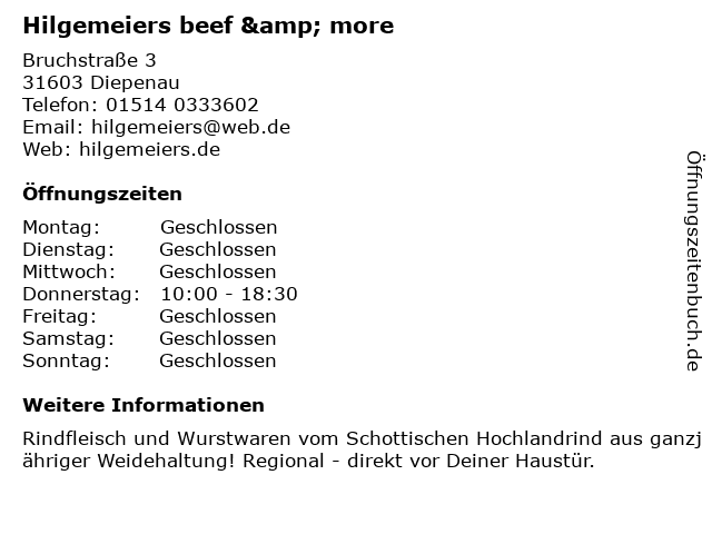 | Öffnungszeiten Hilgemeiers beef & more in Diepenau anzeigen | |