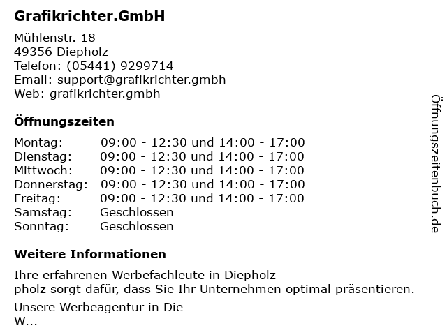 | Öffnungszeiten Grafikrichter.GmbH in Diepholz anzeigen | |