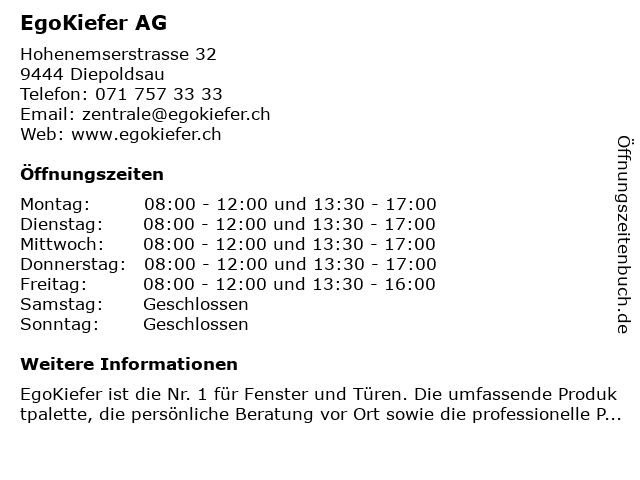 | Öffnungszeiten EgoKiefer AG in Diepoldsau anzeigen | |