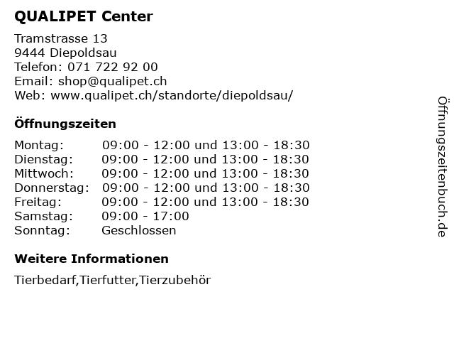 | Öffnungszeiten QUALIPET Center in Diepoldsau anzeigen | |