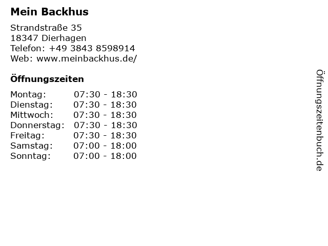 | Öffnungszeiten Mein Backhus in Dierhagen anzeigen | |