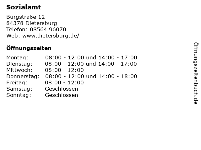 | Öffnungszeiten Sozialamt in Dietersburg anzeigen | |