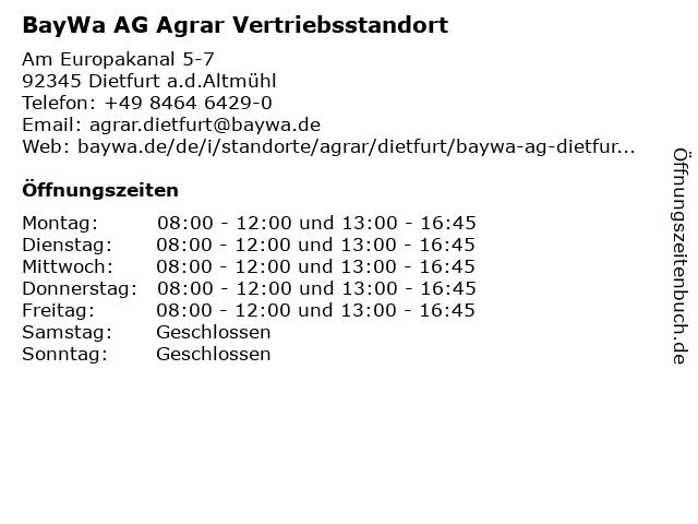 Öffnungszeiten BayWa AG Agrar Vertriebsstandort in Dietfurt a.d.Altmühl anzeigen