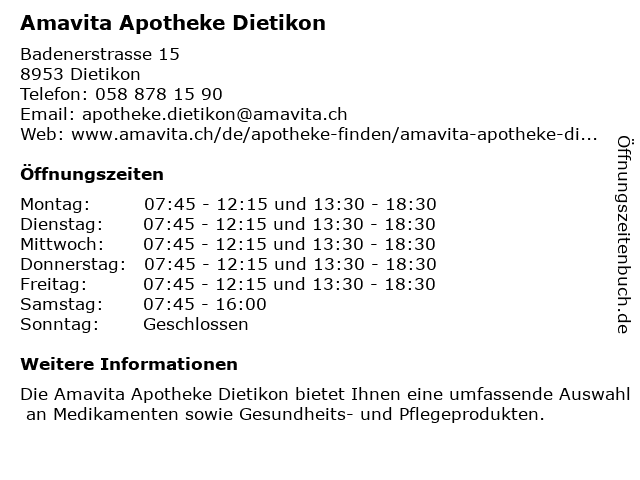 | Öffnungszeiten Amavita Apotheke Dietikon in Dietikon anzeigen | |