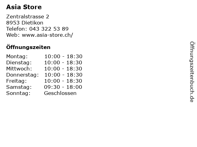 | Öffnungszeiten Asia Store in Dietikon anzeigen | |