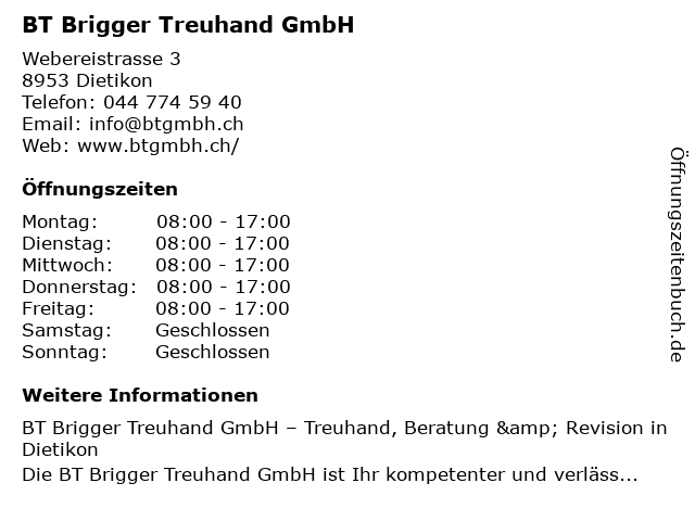 | Öffnungszeiten BT Brigger Treuhand GmbH in Dietikon anzeigen | |