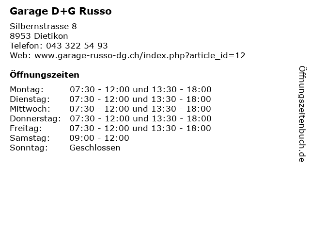 | Öffnungszeiten Garage D+G Russo in Dietikon anzeigen | |