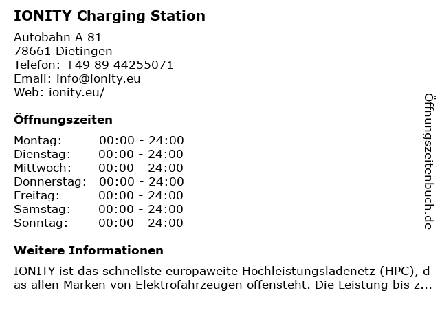 | Öffnungszeiten IONITY Charging Station in Dietingen anzeigen | |