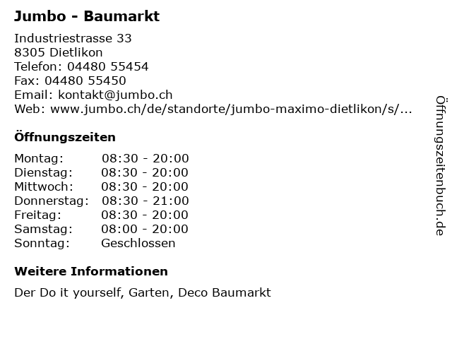 | Öffnungszeiten Jumbo - Baumarkt in Dietlikon anzeigen | |