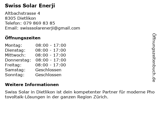 | Öffnungszeiten Swiss Solar Enerji in Dietlikon anzeigen | |
