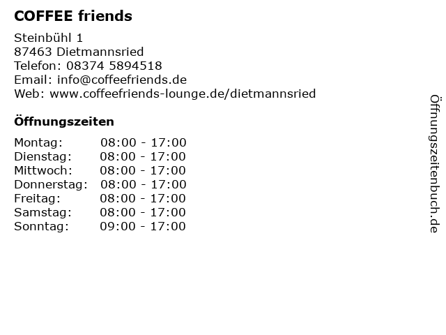 | Öffnungszeiten COFFEE friends in Dietmannsried anzeigen | |