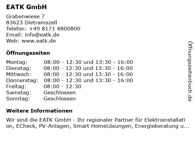 | Öffnungszeiten EATK GmbH in Dietramszell anzeigen | |