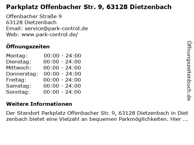 | Öffnungszeiten Parkplatz Offenbacher Str. 9, 63128 Dietzenbach in Dietzenbach anzeigen | |