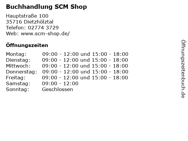 | Öffnungszeiten Buchhandlung SCM Shop in Dietzhölztal anzeigen | |