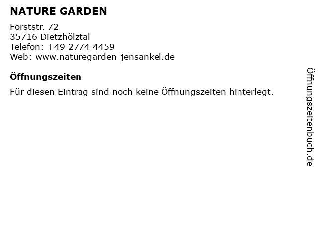 | Öffnungszeiten NATURE GARDEN in Dietzhölztal anzeigen | |