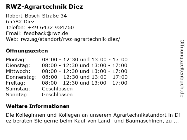 | Öffnungszeiten RWZ-Agrartechnik Diez in Diez anzeigen | |