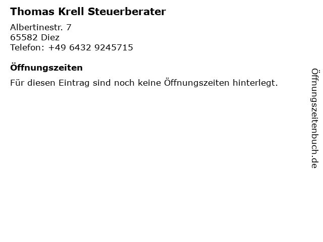 | Öffnungszeiten Thomas Krell Steuerberater in Diez anzeigen | |