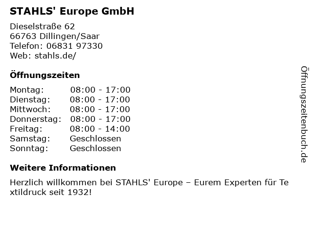 | Öffnungszeiten STAHLS' Europe GmbH in Dillingen/Saar anzeigen | |