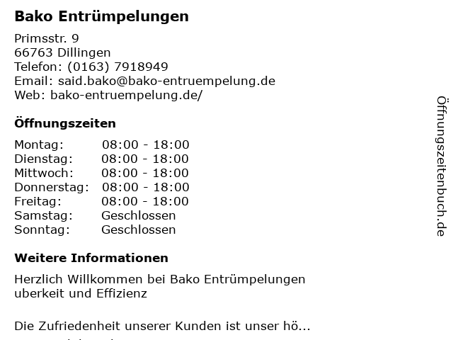 | Öffnungszeiten Bako Entrümpelungen in Dillingen anzeigen | |