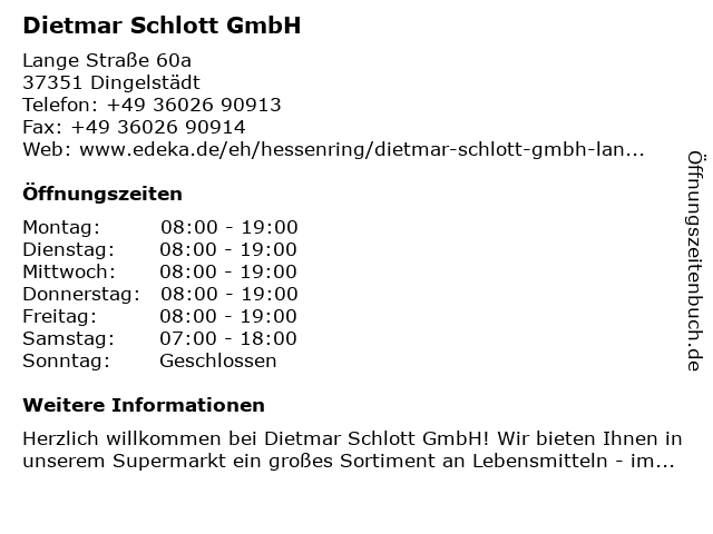 | Öffnungszeiten Dietmar Schlott GmbH in Dingelstädt anzeigen | |