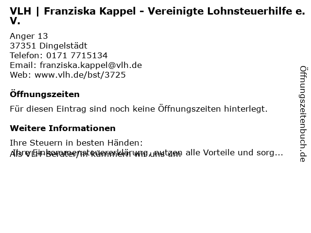 Branchen & Suchbegriffe zu VLH | Franziska Kappel - Vereinigte Lohnsteuerhilfe e.V.:e.v., franziska, kappel, lohnsteuerhilfe, vereinigte, vlh |