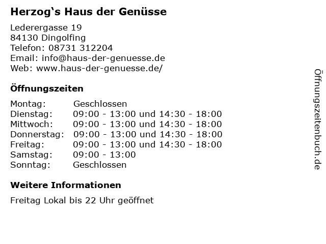 | Öffnungszeiten Herzog‘s Haus der Genüsse in Dingolfing anzeigen | |