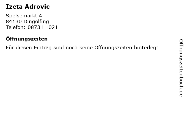 | Öffnungszeiten Izeta Adrovic in Dingolfing anzeigen | |