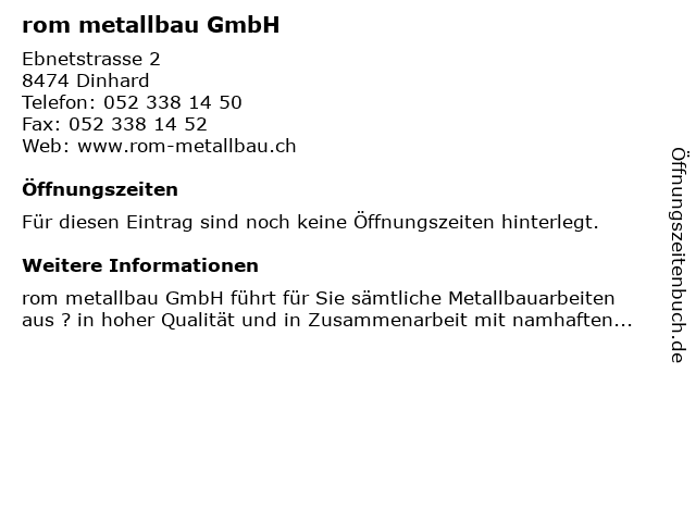 | Öffnungszeiten rom metallbau GmbH in Dinhard anzeigen | |