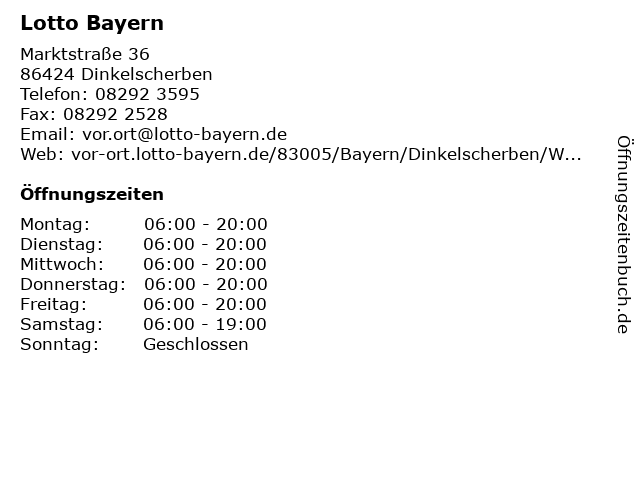 | Öffnungszeiten Lotto Bayern in Dinkelscherben anzeigen | |