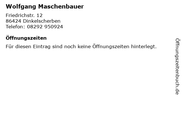 | Öffnungszeiten Wolfgang Maschenbauer in Dinkelscherben anzeigen | |