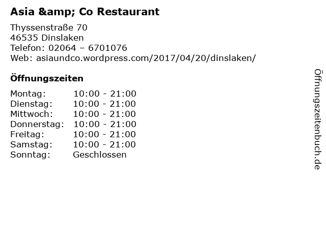 | Öffnungszeiten Asia & Co Restaurant in Dinslaken anzeigen | |