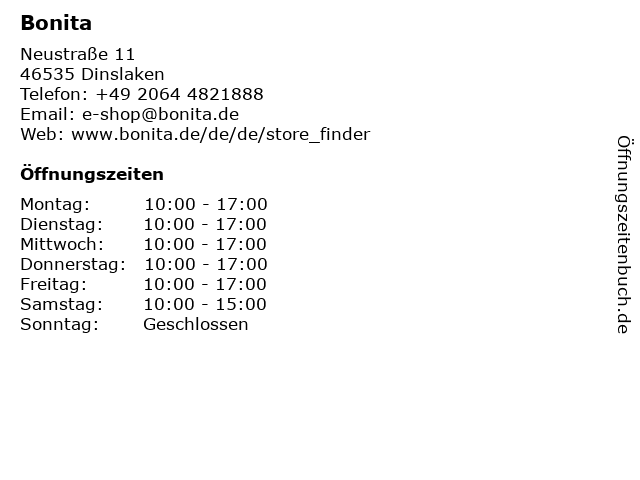 | Öffnungszeiten Bonita in Dinslaken anzeigen | |