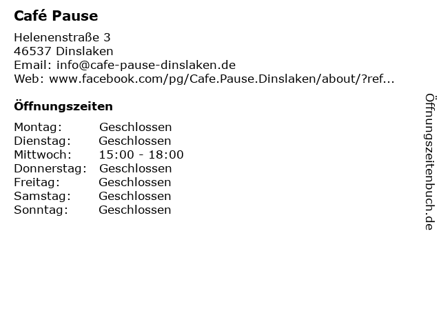 | Öffnungszeiten Café Pause in Dinslaken anzeigen | |